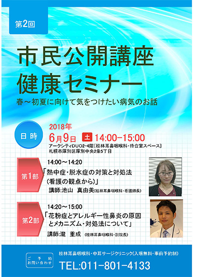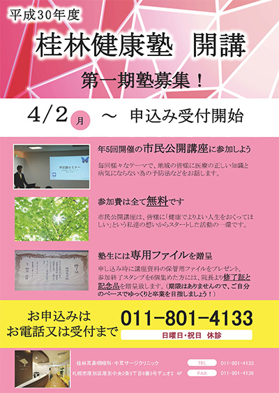 さて、当院ではもっと自身の体の事を知ってもらいたく、地域住民講座を行なっておりますが、それにあたり、さらに「桂林耳鼻咽喉科・健康塾」を開校する事といたしました。